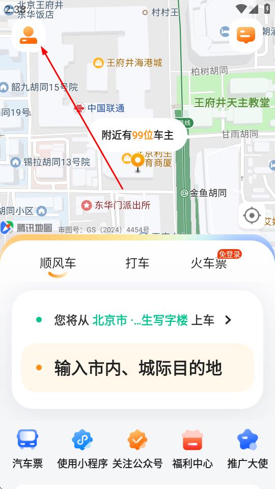 1、打開滴答出行App,點擊左上角的個人頭像圖標。