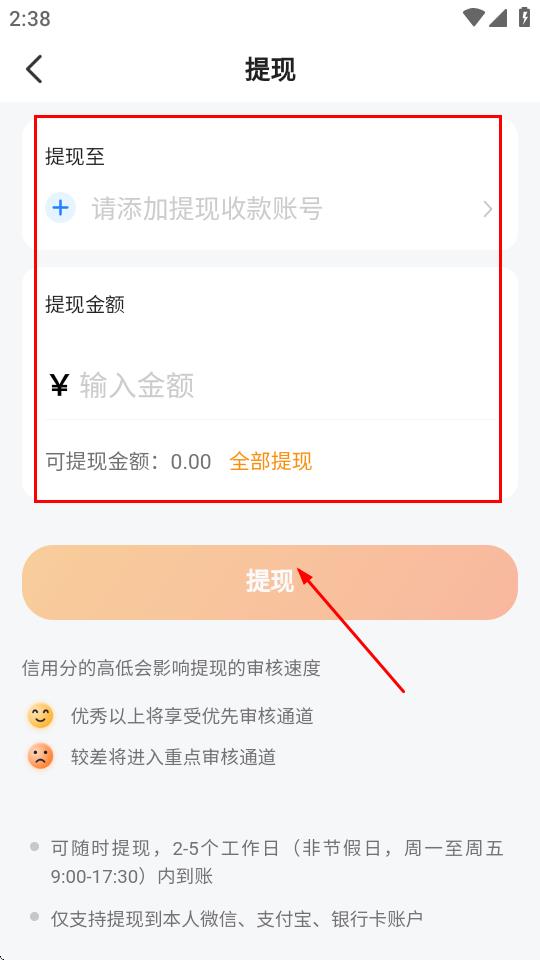 4、在提現(xiàn)頁面,添加提現(xiàn)收款賬號,輸入要提現(xiàn)的金額,點擊提現(xiàn),等待審核到賬即可。