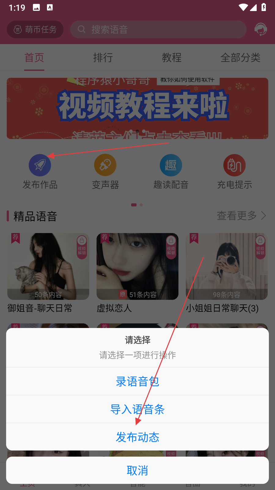 1、打開萌配音應(yīng)用,點(diǎn)擊發(fā)布作品按鈕,點(diǎn)擊錄語音包選項(xiàng)。