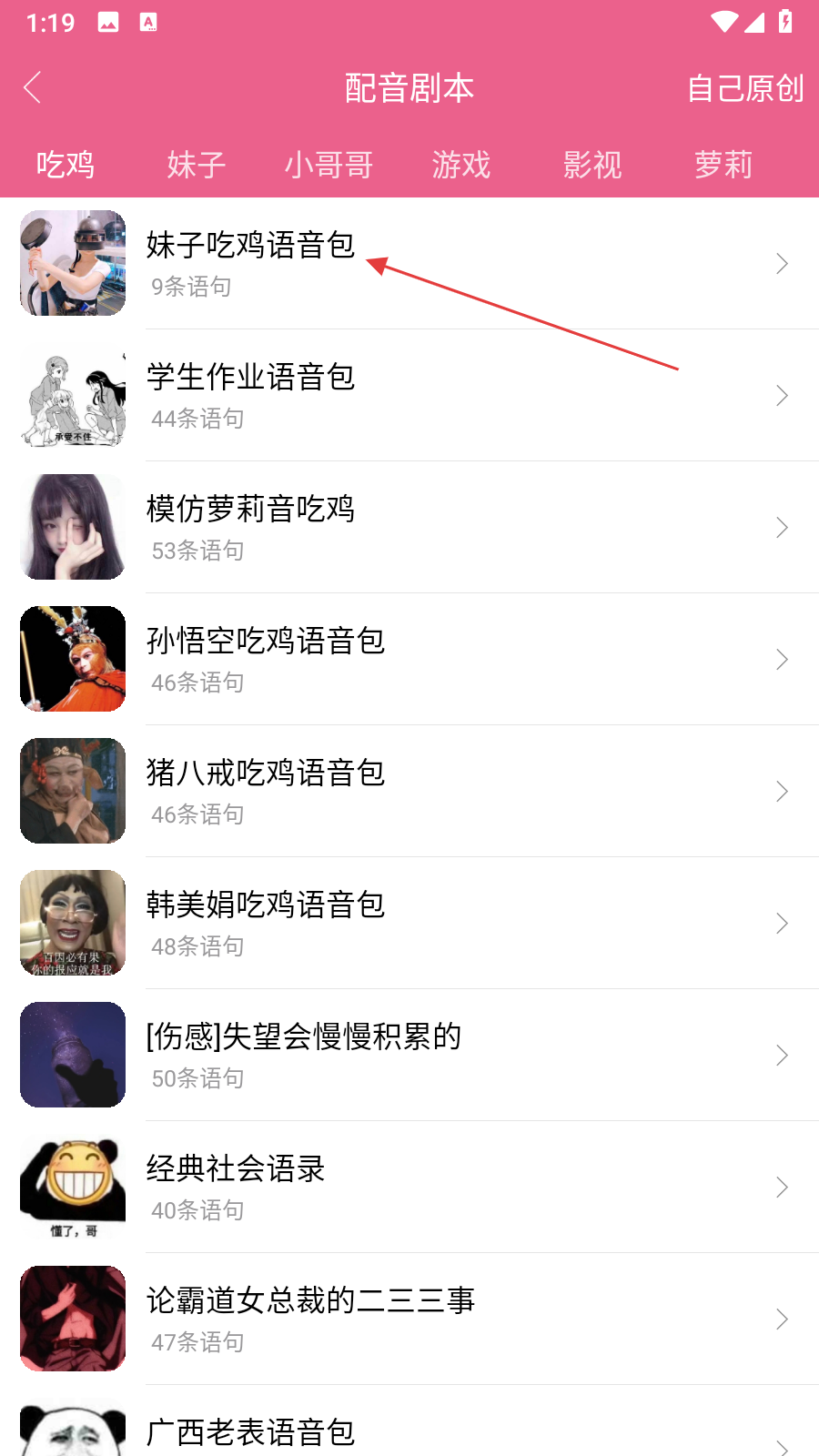 2、進(jìn)入配音劇本選擇頁面,這里有多種分類,根據(jù)自己的需求,點(diǎn)擊選擇一個(gè)語音包類別。