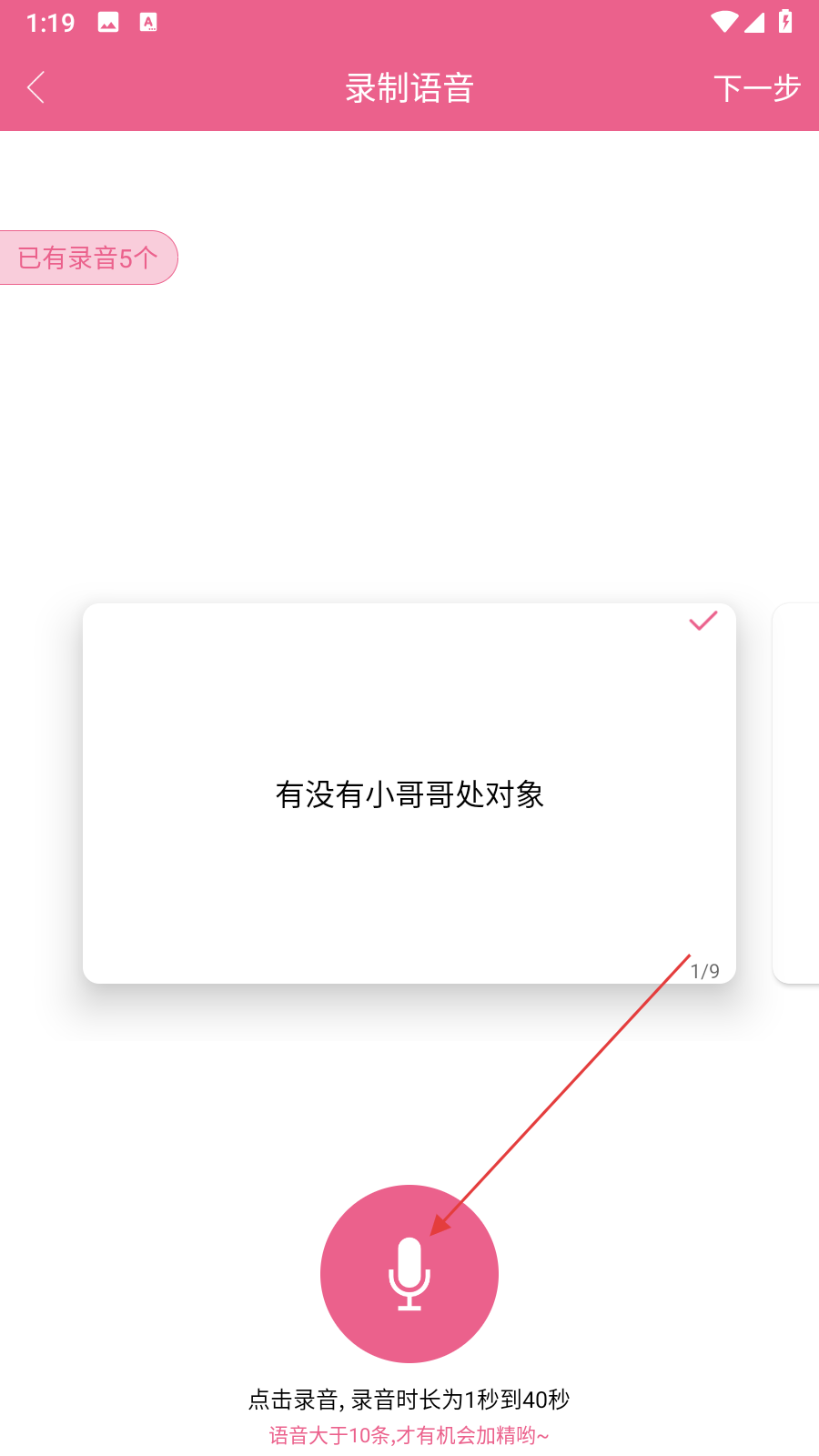 3、進(jìn)入錄制語音界面后,會(huì)看到具體的語音臺(tái)詞,點(diǎn)擊界面下方的粉色麥克風(fēng)按鈕開始錄音,錄音時(shí)長(zhǎng)需控制在1秒到40秒之間。