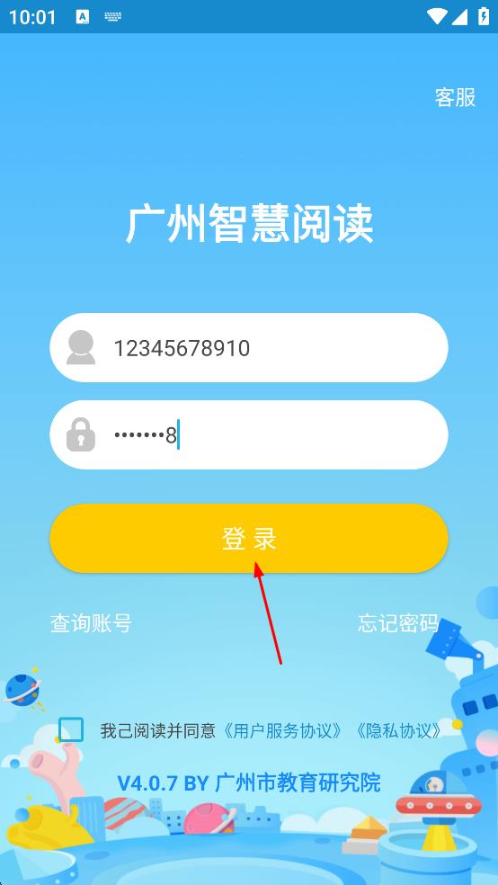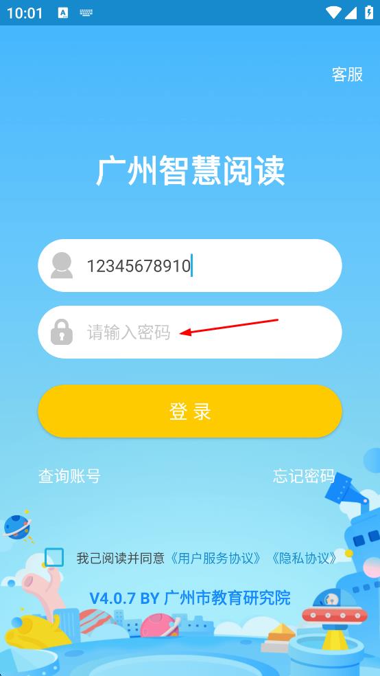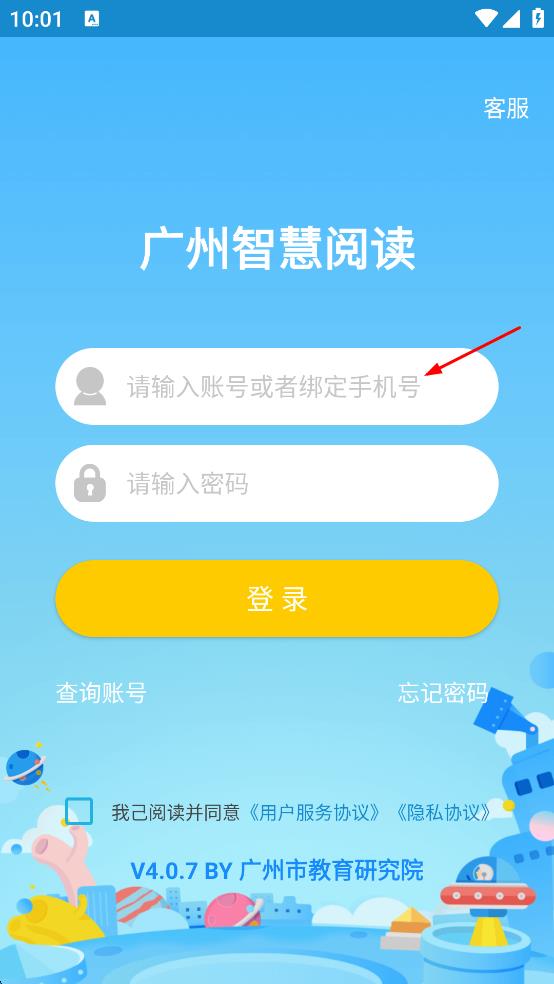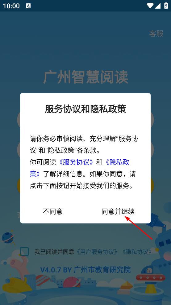 1、打開廣州智慧閱讀,在彈出的服務(wù)協(xié)議和隱私政策頁面,點擊同意并繼續(xù),進(jìn)入登錄頁面。
