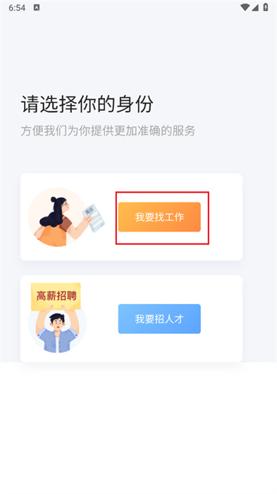 1、進入到應(yīng)用之中后,用戶需要進行個人身份定位的選擇,可以點擊【我要找工作】按鈕,以進行工作的尋找;