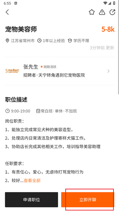 5、可以在進入后點擊右下角的【立即開聊】按鈕來進行工作內(nèi)容的了解。