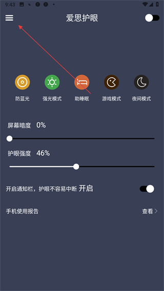1、打開(kāi)愛(ài)思護(hù)眼應(yīng)用,點(diǎn)擊界面左上角三條橫線樣式的菜單圖標(biāo),進(jìn)入設(shè)置頁(yè)面。