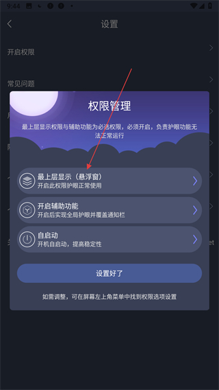 3、彈出權(quán)限管理窗口,在該窗口中找到最上層顯示(懸浮窗)選項(xiàng)。