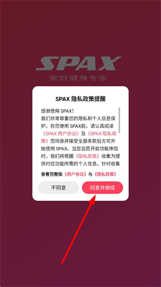 1、打開SPAX后,在隱私政策提醒界面,點(diǎn)擊同意并繼續(xù),進(jìn)入登錄選擇界面。