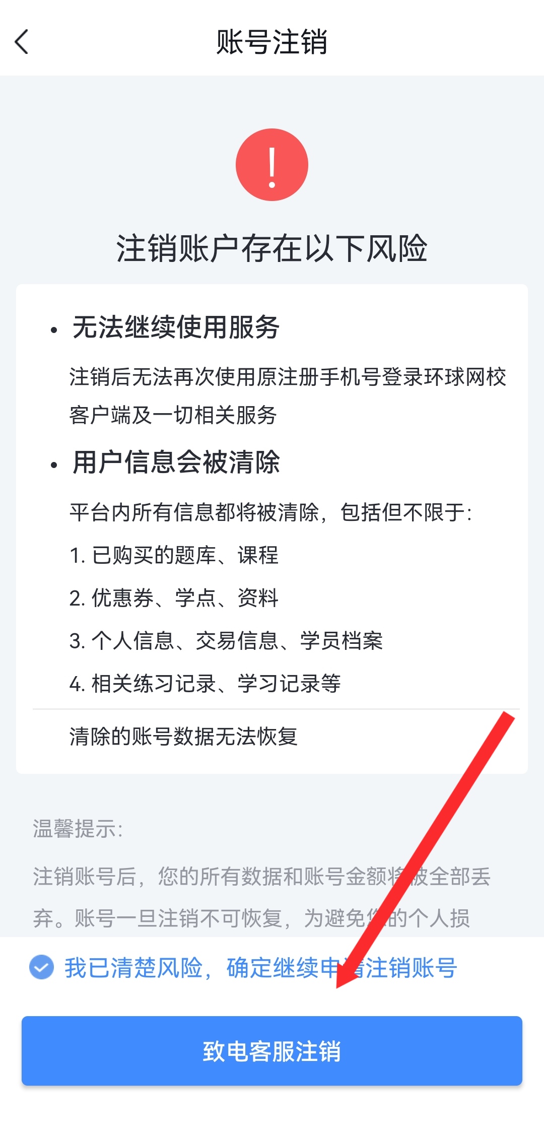 4、在注銷的說明頁(yè),點(diǎn)擊致電客服注銷按鈕,完成賬號(hào)注銷。