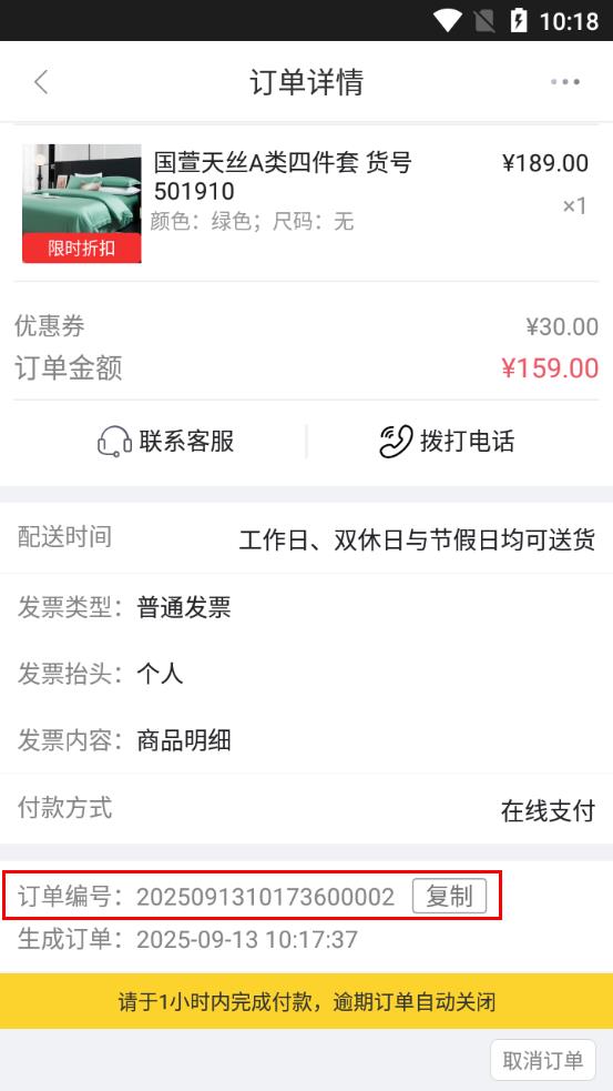 4、在訂單詳情頁中,找到訂單編號一欄,即可查看該訂單的訂單號。