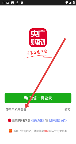 1、點擊“用戶隱私政策”彈窗的“同意”,進入央廣購物APP登錄選擇頁面。