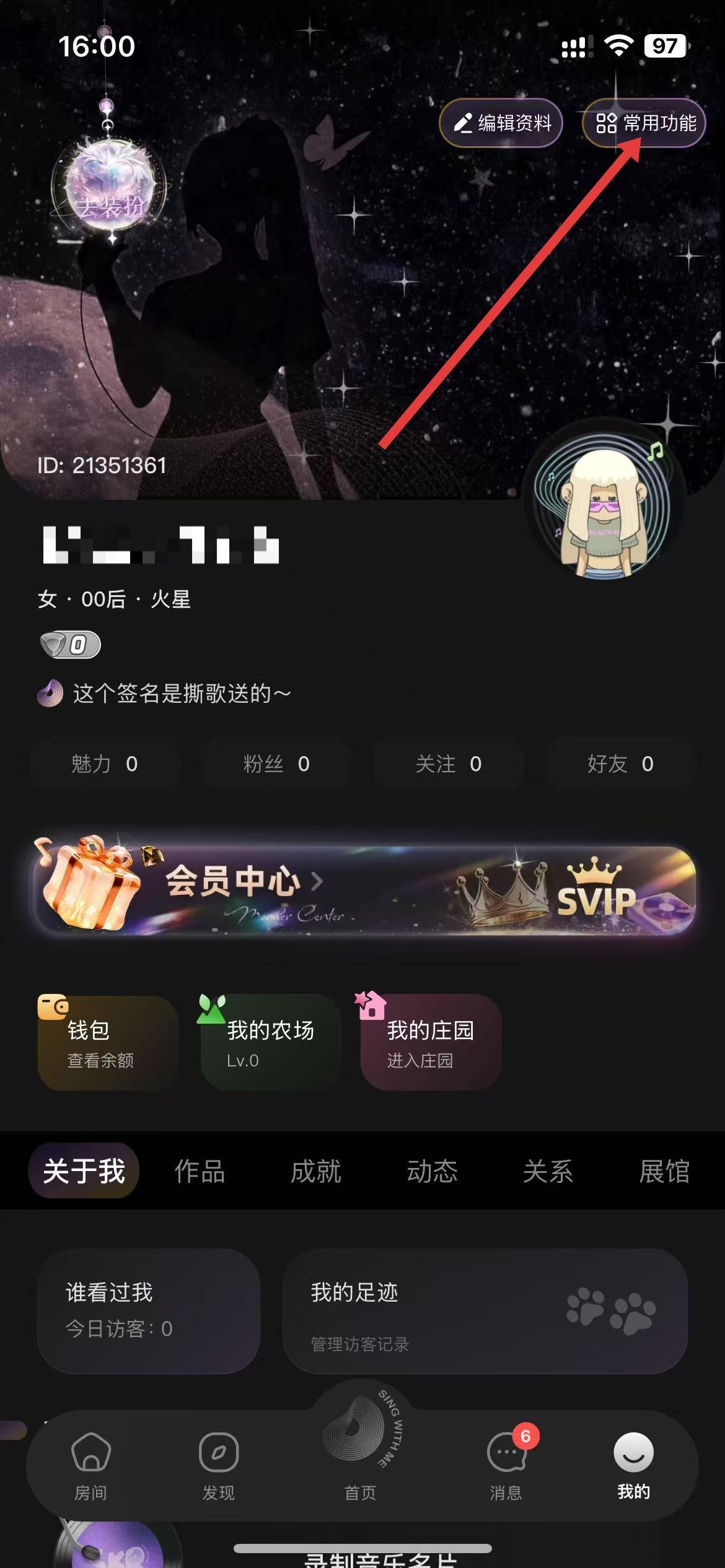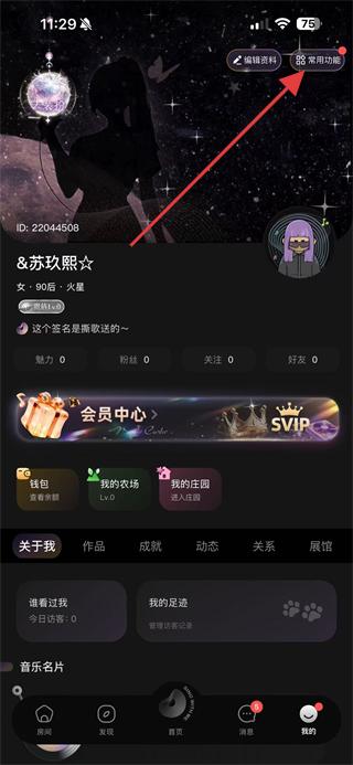 2、在個(gè)人頁(yè)面中,點(diǎn)擊右上角的常用功能按鈕,展開功能菜單。