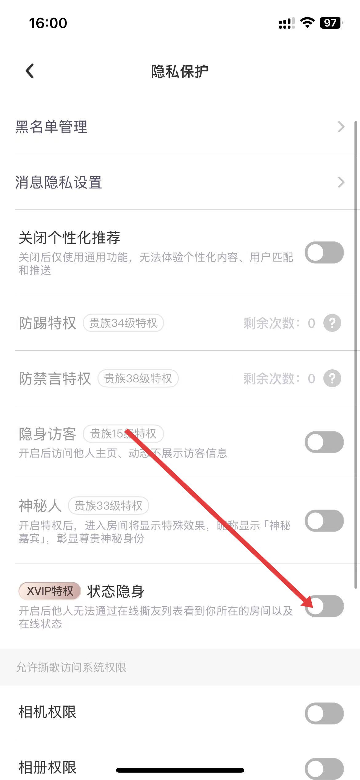 3、在隱私保護(hù)頁(yè)面,找到狀態(tài)隱身選項(xiàng),點(diǎn)擊其右側(cè)開關(guān)按鈕,開啟后即可隱身。