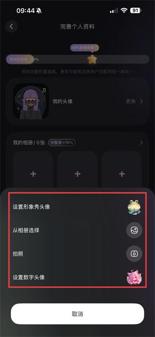 4、在彈出的選項(xiàng)中選擇設(shè)置形象秀頭像、從相冊(cè)選擇、拍照或設(shè)置數(shù)字頭像的方式,完成撕歌頭像的更改操作。