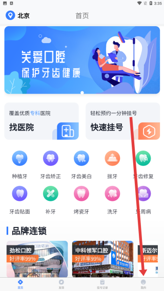 1、在口腔科醫(yī)院掛號網(wǎng)首頁中,可以點擊右下角我的按鈕,進入到我的主頁。