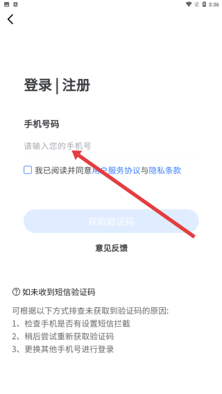 3、可以在輸入框中輸入手機號,若沒有注冊過獲取驗證碼后可直接注冊后登錄。