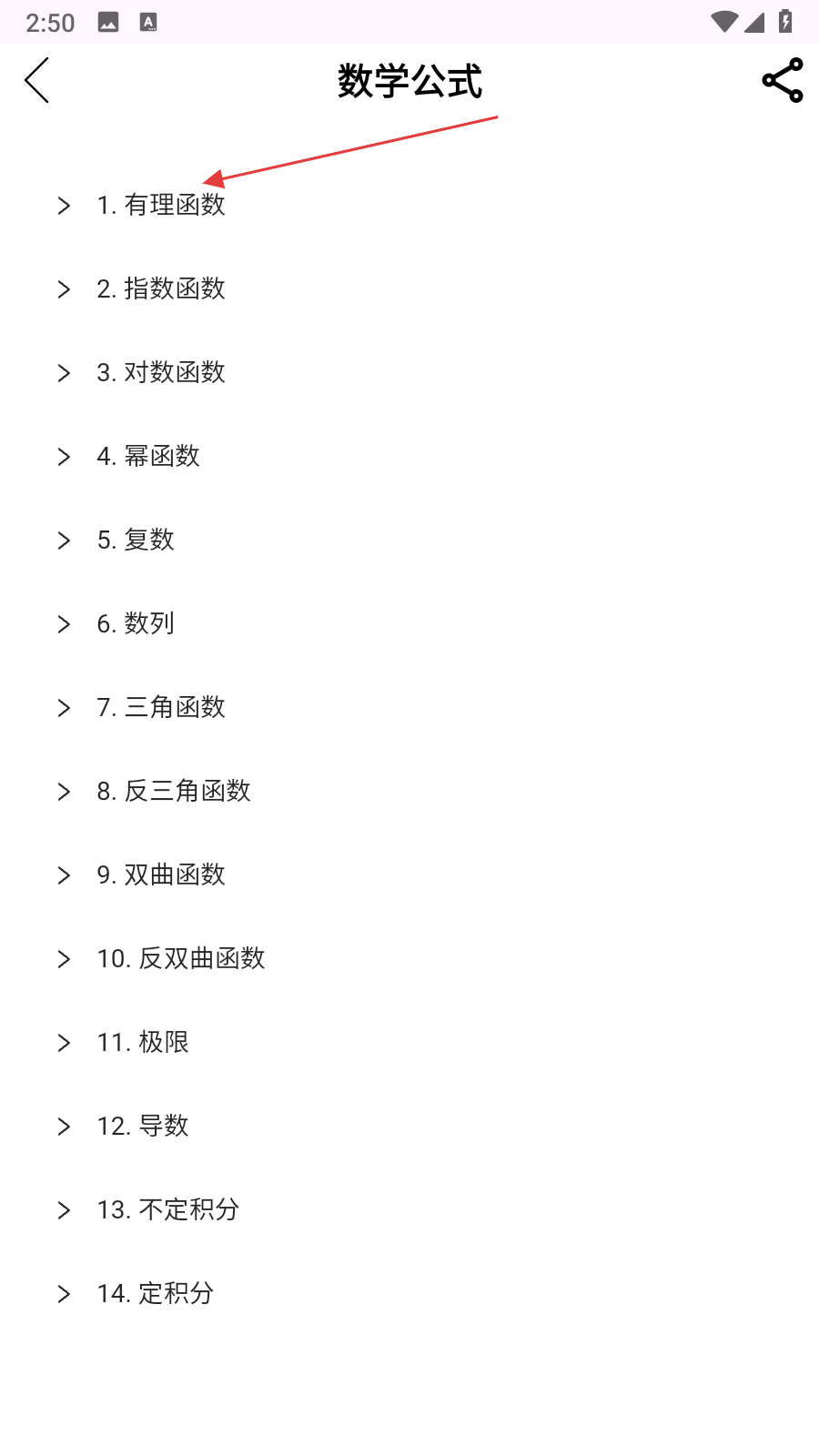 3、該頁面羅列了有理函數(shù)、指數(shù)函數(shù)、對(duì)數(shù)函數(shù)等多種數(shù)學(xué)公式分類,根據(jù)學(xué)習(xí)或計(jì)算需求,點(diǎn)擊對(duì)應(yīng)公式分類,查看該分類下的具體公式內(nèi)容。