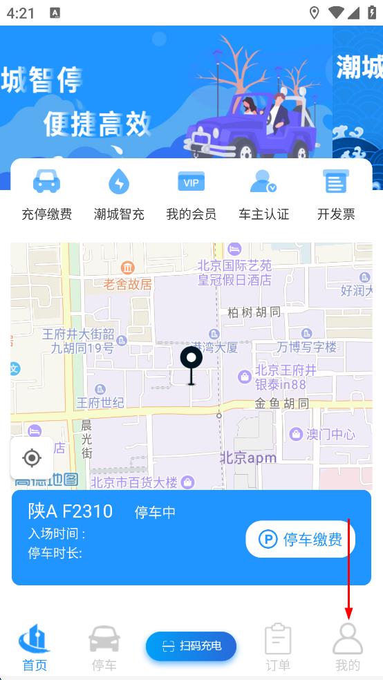 1、打開潮城智停APP,進(jìn)入首頁后,點(diǎn)擊底部導(dǎo)航欄最右側(cè)的“我的”選項,進(jìn)入個人中心頁面。