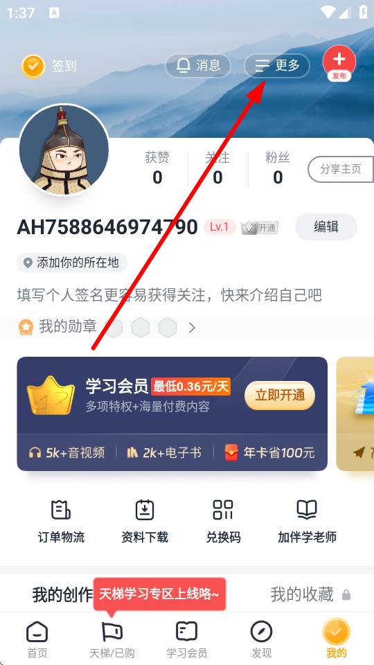 1、在我的頁面,點(diǎn)擊右上角更多按鈕,進(jìn)入更多功能的界面。