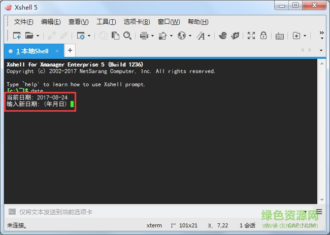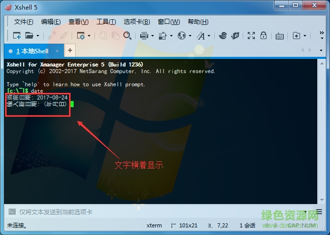 比如我們在Xshell中輸入命令“date”,然后按回車鍵,會(huì)顯示當(dāng)前的具體日期,如下圖所示,可以看到中文是橫著顯示的。