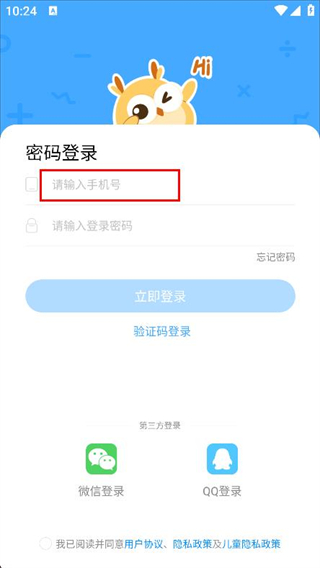 2、在密碼登錄頁(yè)面,點(diǎn)擊輸入框輸入手機(jī)號(hào)。