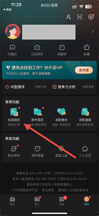 2、在個人頁面中,點擊在線簡歷選項,進入簡歷頁面。