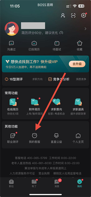 2、在我的頁面,找到我的客服選項并點擊,進入客服直直界面。