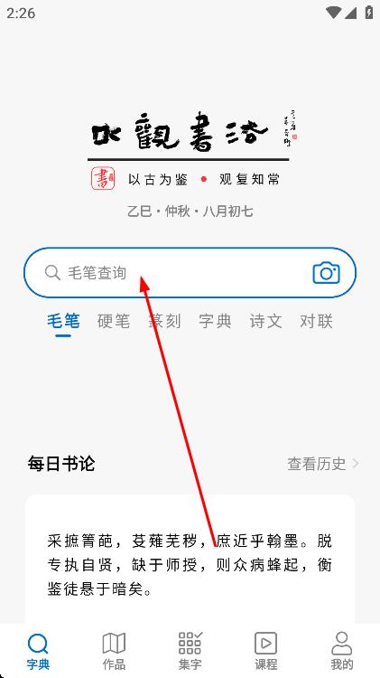1、打開以觀書法app,在首頁找到搜索框,點(diǎn)擊進(jìn)入。