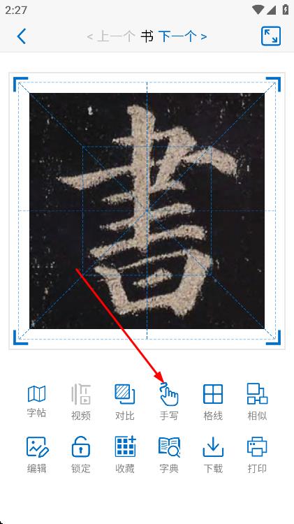 4、進(jìn)入字體詳情頁后,點(diǎn)擊下方手寫按鈕,即可進(jìn)行手寫練習(xí)。