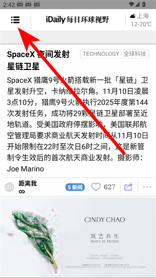 1、打開iDaily每日環(huán)球視野app,點(diǎn)擊左上角菜單圖標(biāo),展開功能菜單。