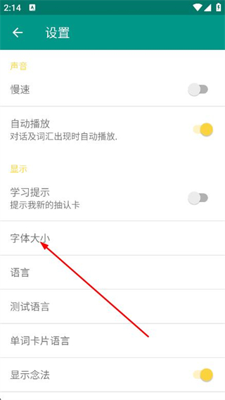 3、進(jìn)入設(shè)置頁(yè)面后,找到并點(diǎn)擊字體大小選項(xiàng)。