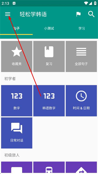 1、打開輕松學(xué)韓語(yǔ),點(diǎn)擊左上角的菜單圖標(biāo)。