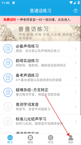 1、打開學(xué)好普通話APP,進入主界面后,點擊底部導(dǎo)航欄最右側(cè)的我的選項。