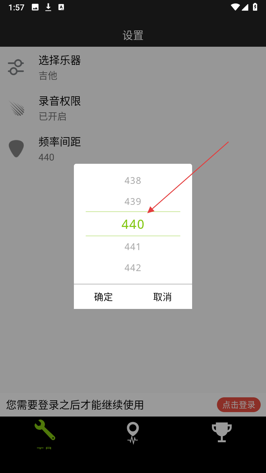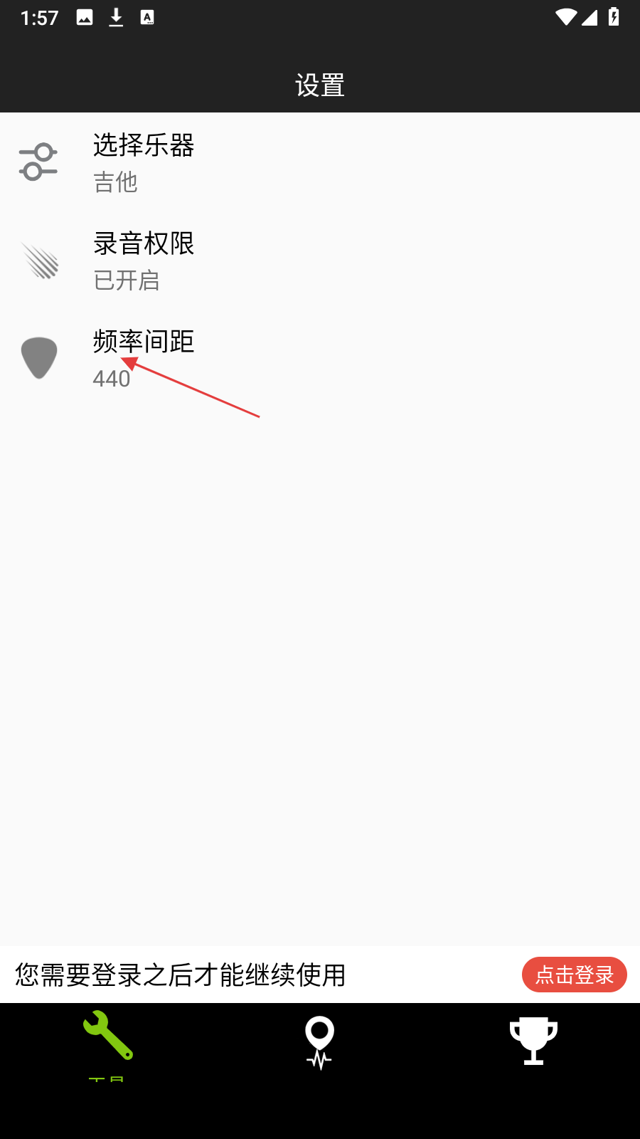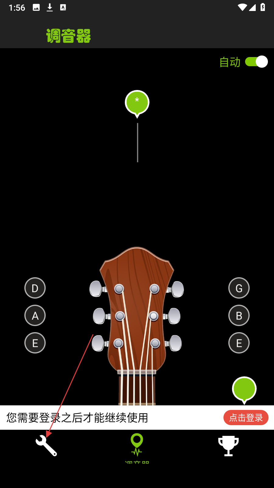 1、打開(kāi)吉他調(diào)音器應(yīng)用,點(diǎn)擊界面左下角扳手形狀的工具圖標(biāo),進(jìn)入設(shè)置頁(yè)面。
