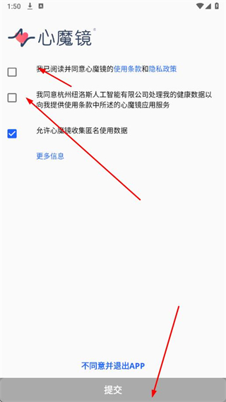 1、打開心魔鏡APP,在初始頁(yè)面勾選兩個(gè)協(xié)議后,點(diǎn)擊提交。