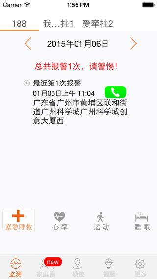 老人佩戴的愛牽掛腕表設(shè)有SOS緊急呼救鍵,遇險(xiǎn)時(shí)主動(dòng)按下SOS緊急呼救鍵直接通知家人。同時(shí),愛牽掛腕表具有傷害判定功能,根據(jù)心率以及身體動(dòng)作數(shù)據(jù),通過緊密算法判定老人的受傷害狀況,即使不能主動(dòng)呼救,也能自動(dòng)啟動(dòng)發(fā)出呼救。