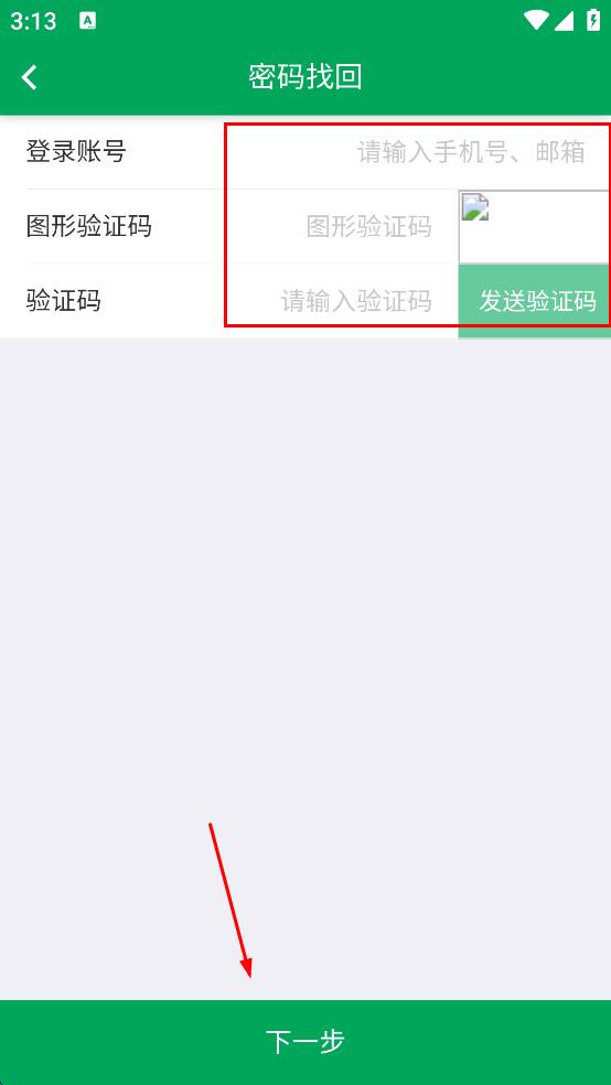 4、在密碼找回頁(yè)面輸入登錄賬號(hào)、圖形驗(yàn)證碼,點(diǎn)擊發(fā)送驗(yàn)證碼并輸入,然后點(diǎn)擊下一步。