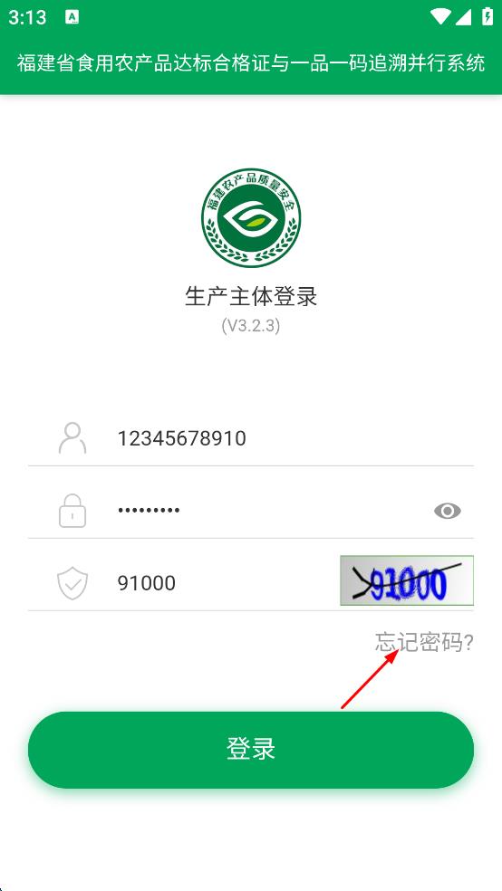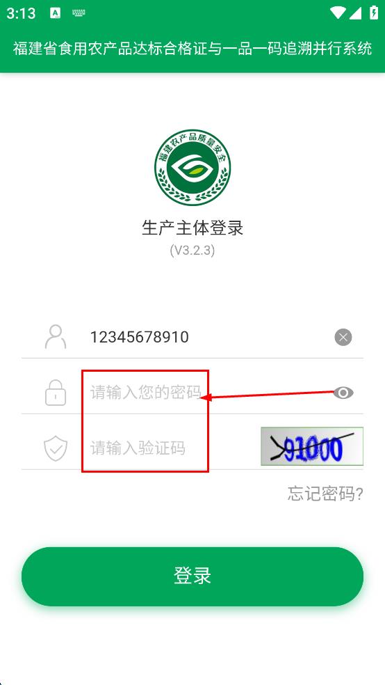 1、打開(kāi)福建省食用農(nóng)產(chǎn)品達(dá)標(biāo)合格證與一品一碼追溯并行系統(tǒng),進(jìn)入生產(chǎn)主體登錄頁(yè)面,在密碼輸入框輸入密碼。