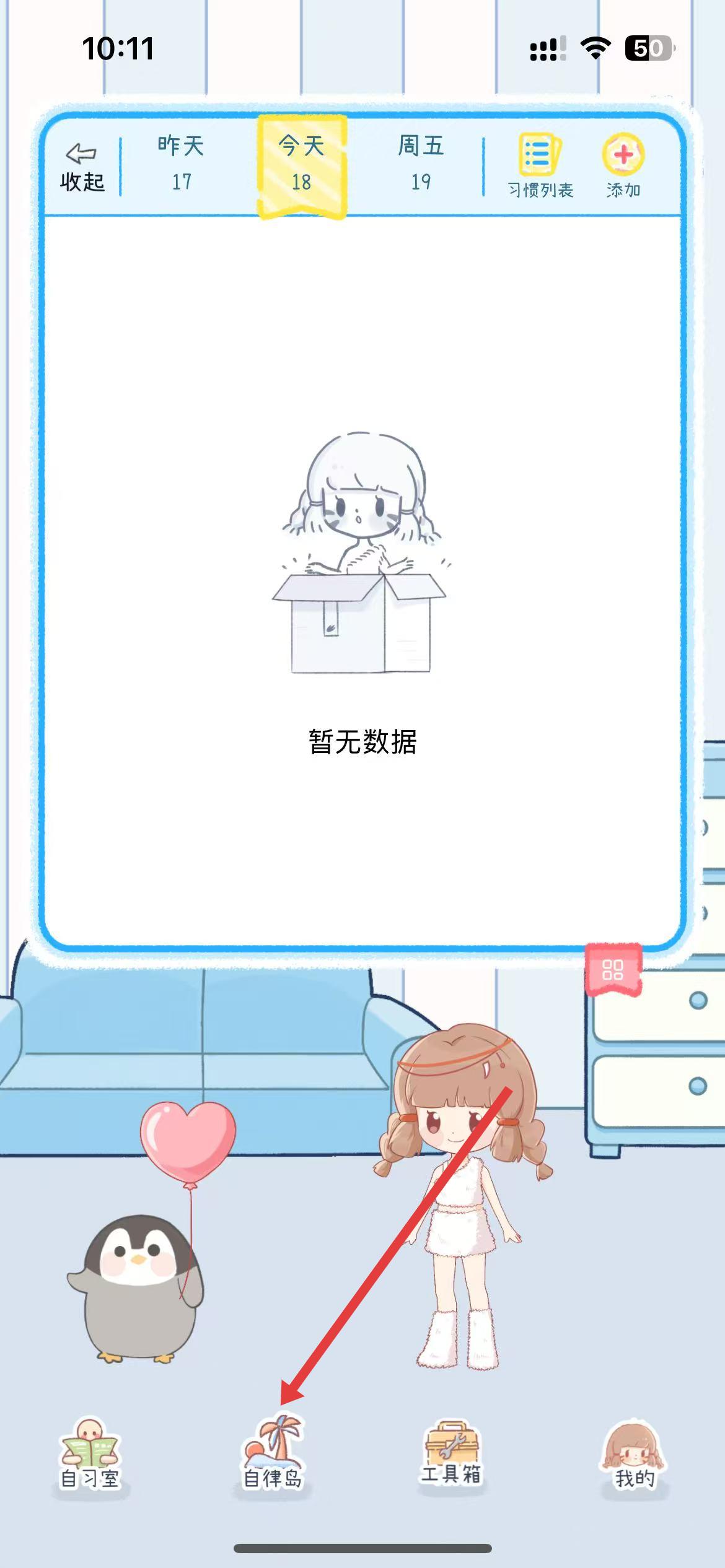 1、打開點(diǎn)點(diǎn)時光app,在主界面下方點(diǎn)擊自律島按鈕,進(jìn)入自律島相關(guān)界面。
