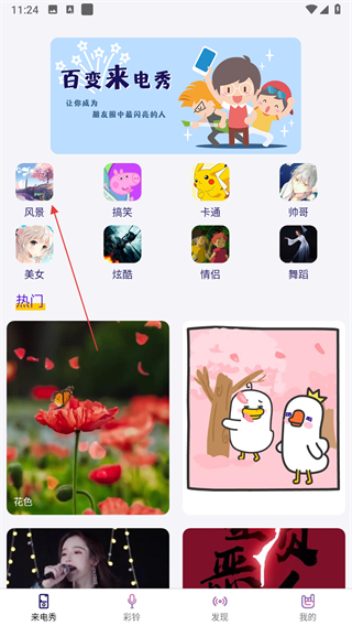 1、打開來電秀類應(yīng)用,進(jìn)入來電秀頁面,點(diǎn)擊喜歡的分類圖標(biāo),進(jìn)入該分類的素材列表頁。