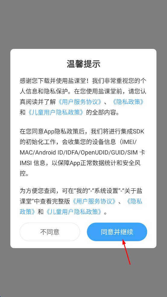 1、打開鹽課堂,在彈出的溫馨提示頁面,點擊同意并繼續(xù),進入鹽課堂選課頁面。