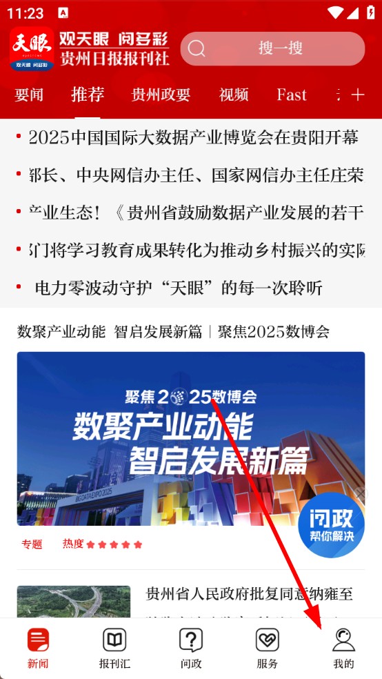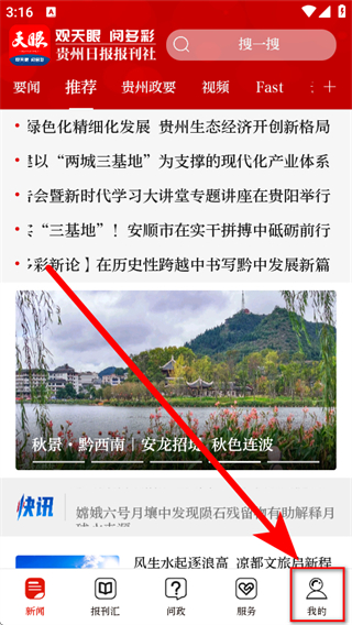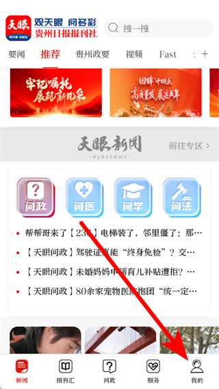 1、打開天眼新聞APP,進(jìn)入時(shí)點(diǎn)擊右下方我的。