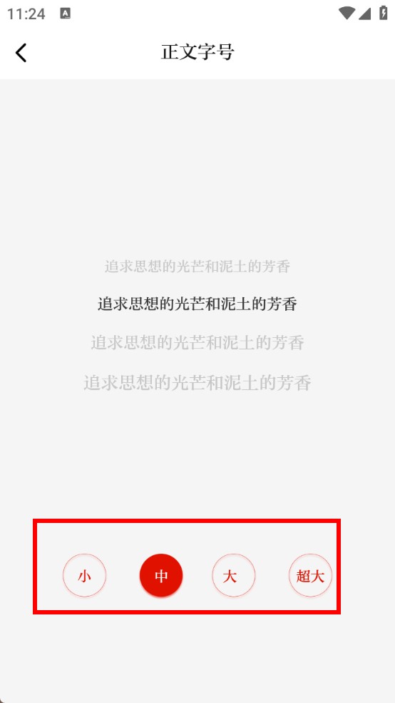 4、在正文字號(hào)設(shè)置頁面,選擇小、中、大、超大其中一個(gè)選項(xiàng),即可完成字體大小的更改。