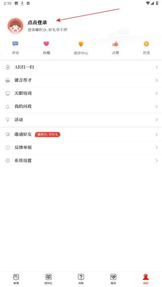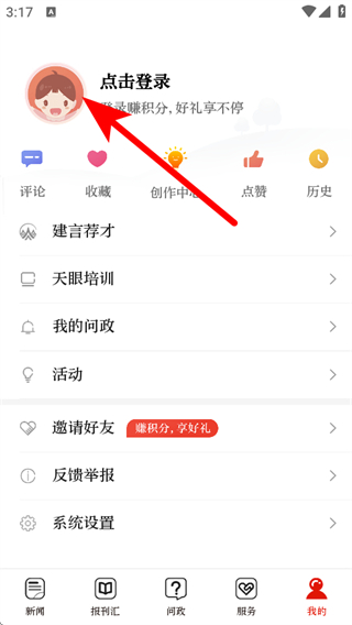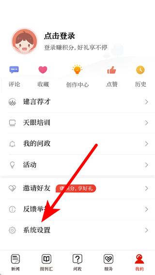1、打開天眼新聞app,點(diǎn)擊底部我的,進(jìn)入個(gè)人的頁面。