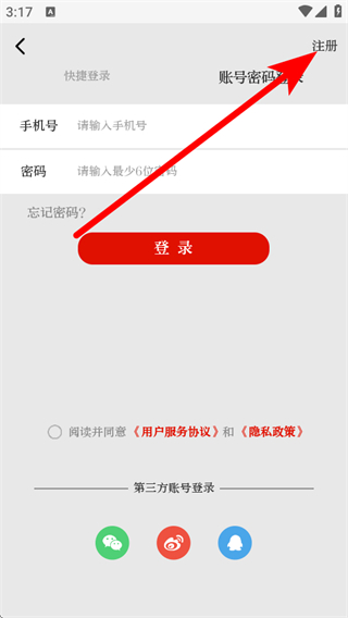 3、在登錄頁面點(diǎn)擊右上角注冊(cè),進(jìn)入注冊(cè)信息填寫頁面。