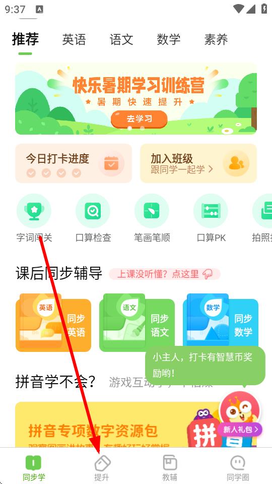 1、打開冀教app小學(xué)版進入主界面,點擊底部提升選項,切換到提升學(xué)習(xí)內(nèi)容界面。