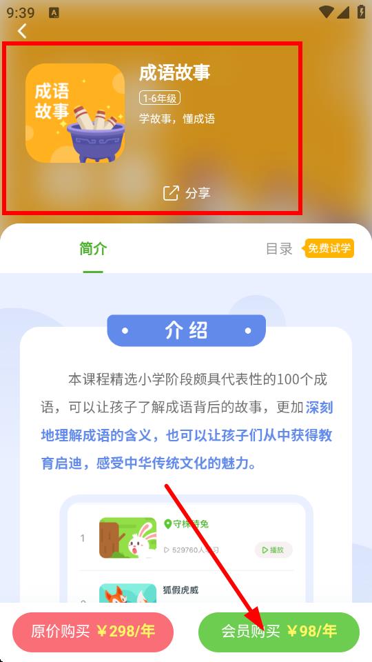 4、在成語故事課程頁面,可查看課程簡介,若想購買課程,會員用戶點擊會員購買按鈕,按照提示完成操作即可學(xué)習(xí)課程內(nèi)容。