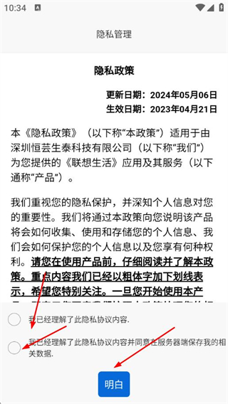 1、打開聯(lián)想生活A(yù)PP,勾選協(xié)議,點(diǎn)擊明白。