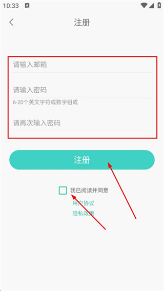 3、輸入郵箱、密碼,再次確認(rèn)密碼,勾選協(xié)議,點(diǎn)擊注冊(cè)。