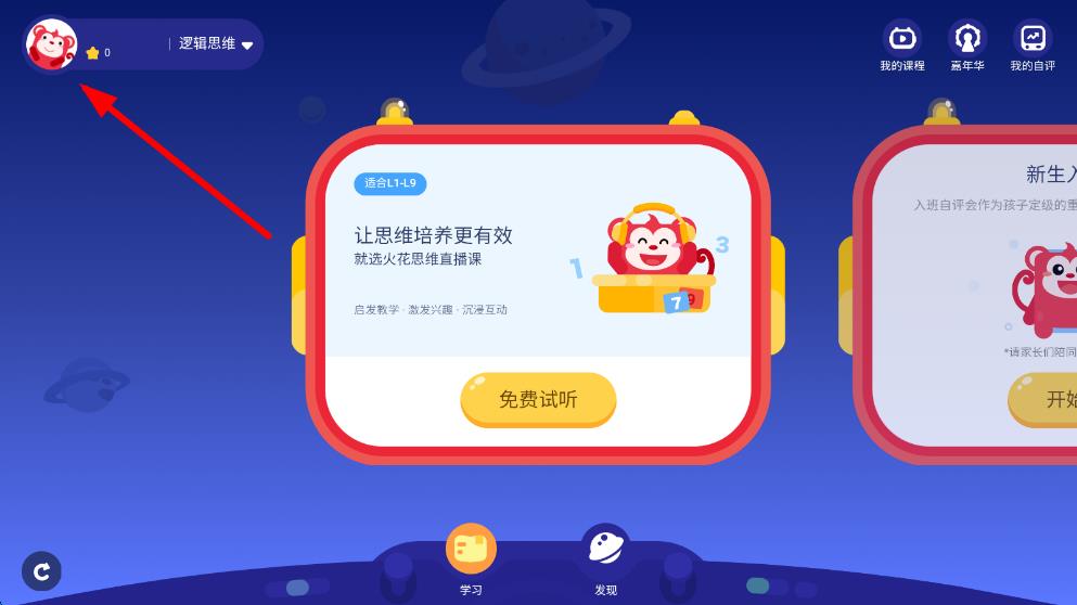 1、打開火花思維學生端app后,點擊界面左上角的頭像圖標。