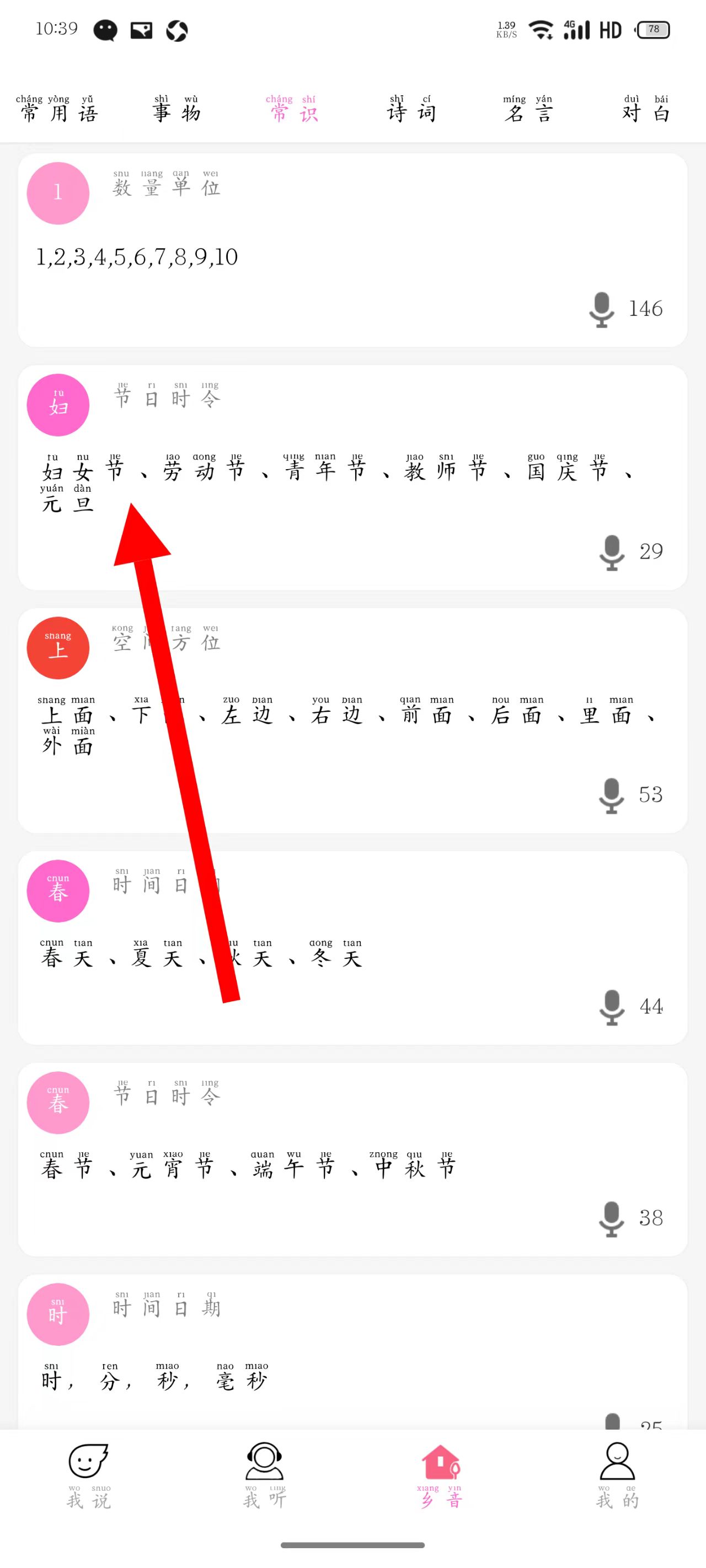 3、在常識分類界面中找到節(jié)日時令相關(guān)內(nèi)容,點擊進(jìn)入具體節(jié)日方言展示界面。